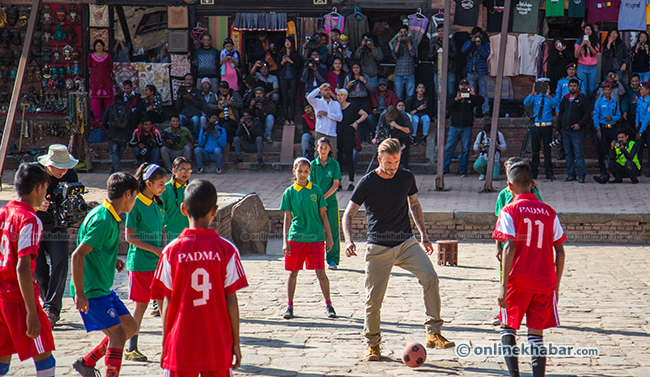 विनाशकारी भूकम्पले थिलथिलो भएको भक्तपुरको पाँच तले मन्दिर परिसरमा शुक्रबार निकै रमाइलो माहोल थियो ।वरिपरि विद्यार्थीदेखि युवाहरु हुटिङ गरिरहेका थिए भने मन्दिर प्राङ्गणको एक भागमा इंग्ल्याण्डका चर्चित फुटबलर डेभिड बेकहृयाम बालबालिकासँग फुटबल खेलिरहेका थिए ।।
